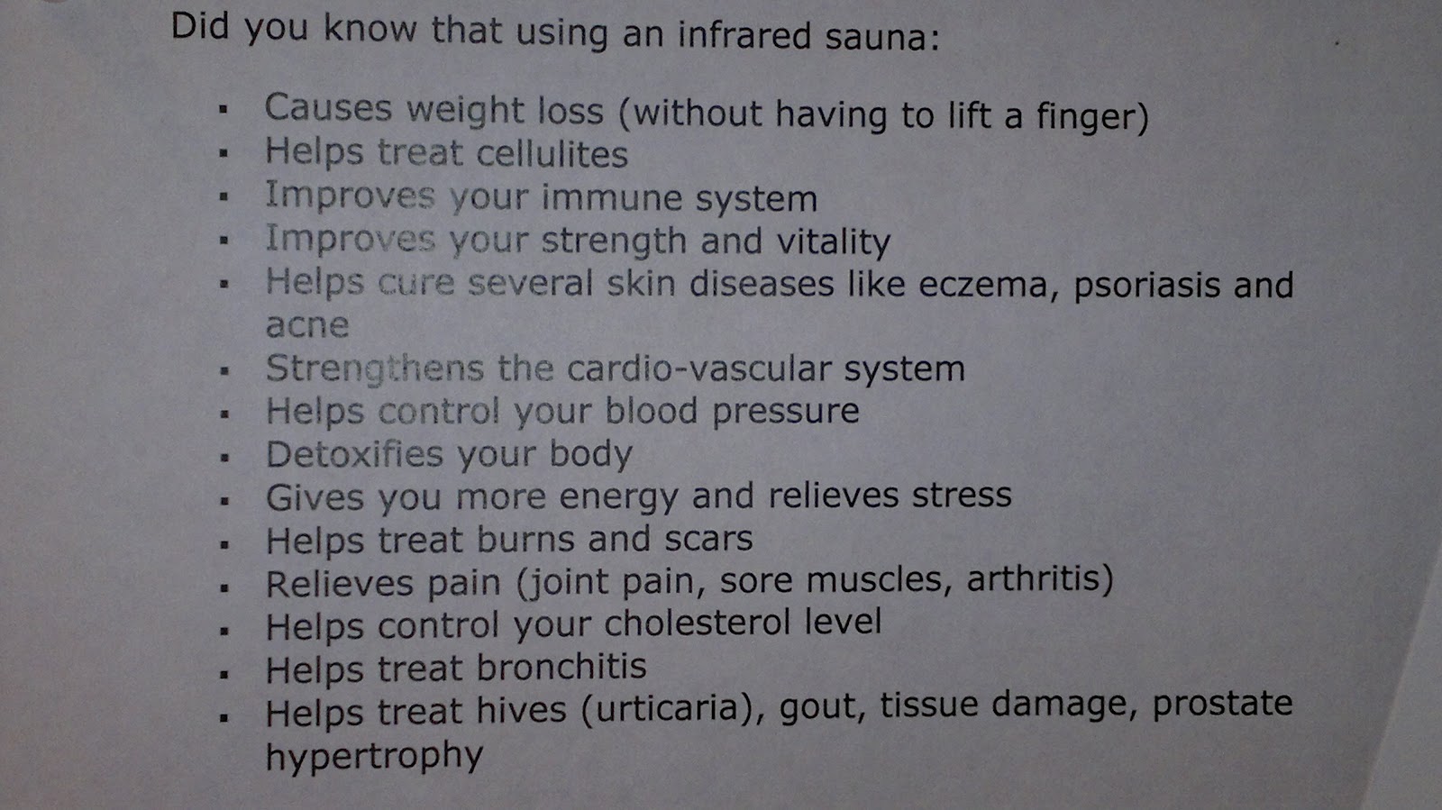 There is a big long list of things the infared sauna is good for. It was moisture free (no steam) so apparently it is safe to even take your computer in there!